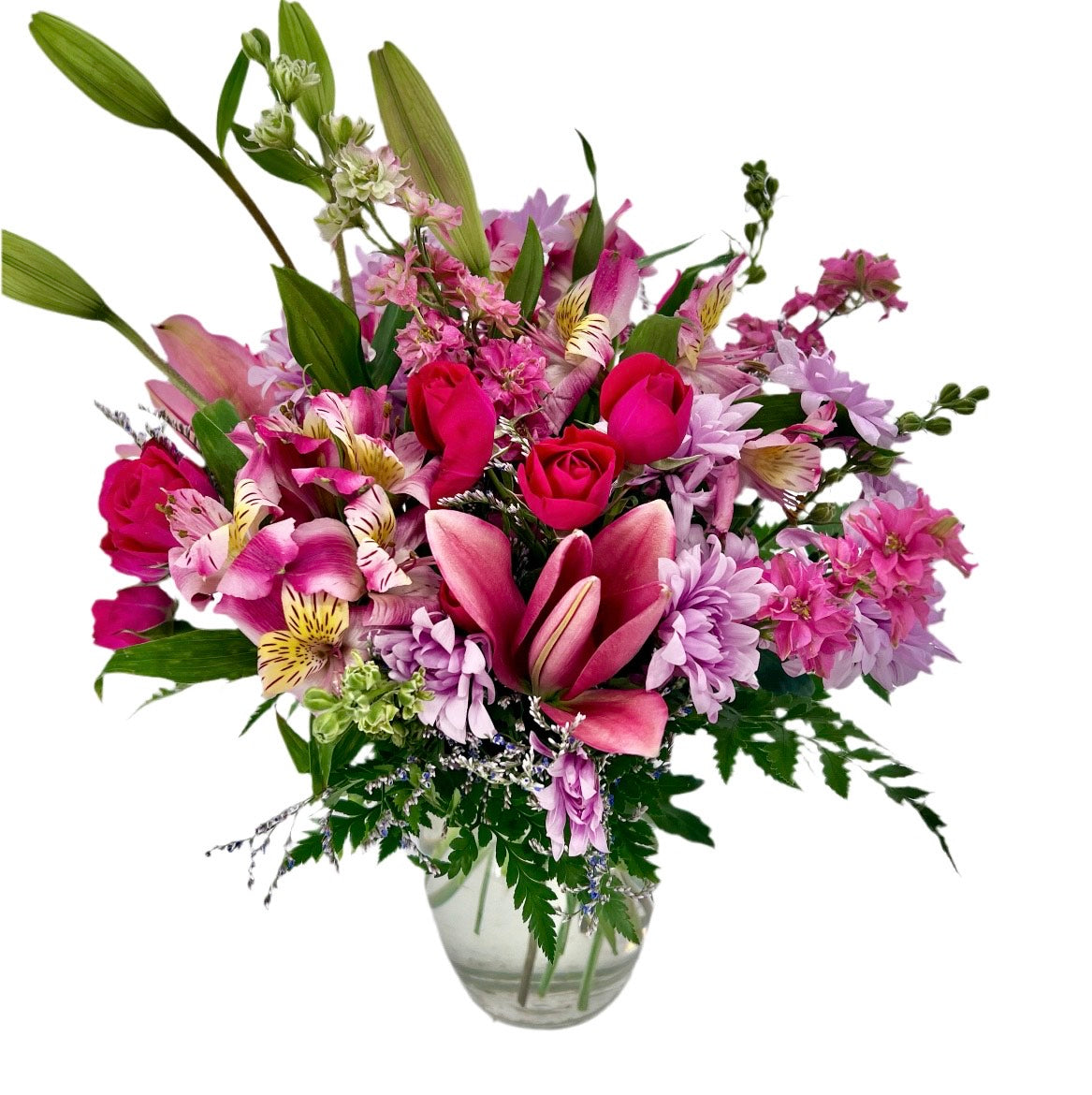 Experience the enchanting aura of Cupid's Garden, with its charming combination of lilies, sweetheart roses, larkspur, and Peruvian lilies. These fresh flowers exude a romantic, garden vibe with their delicate pink and lavender hues. Perfect for expressing heartfelt sentiments or adding a touch of elegance to any space.