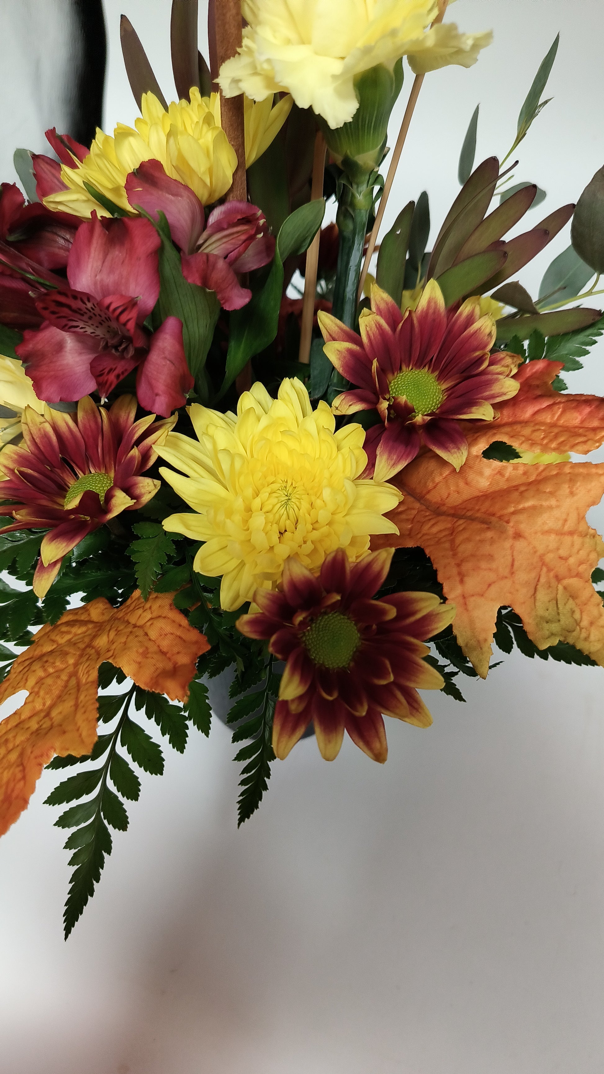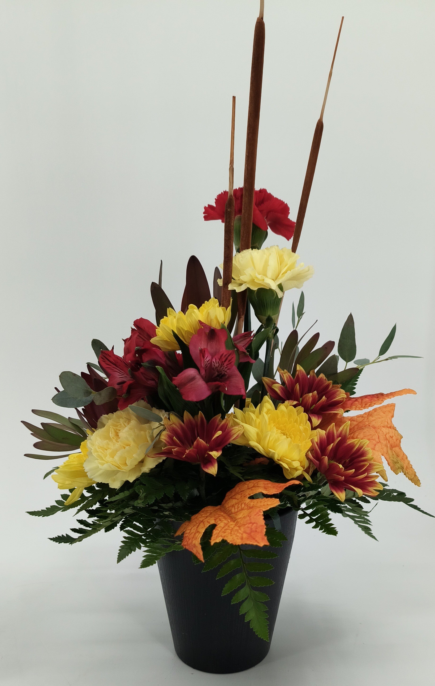 Rich colors of fall enhanced by cattail and leaves make this a simply splendid arrangement.