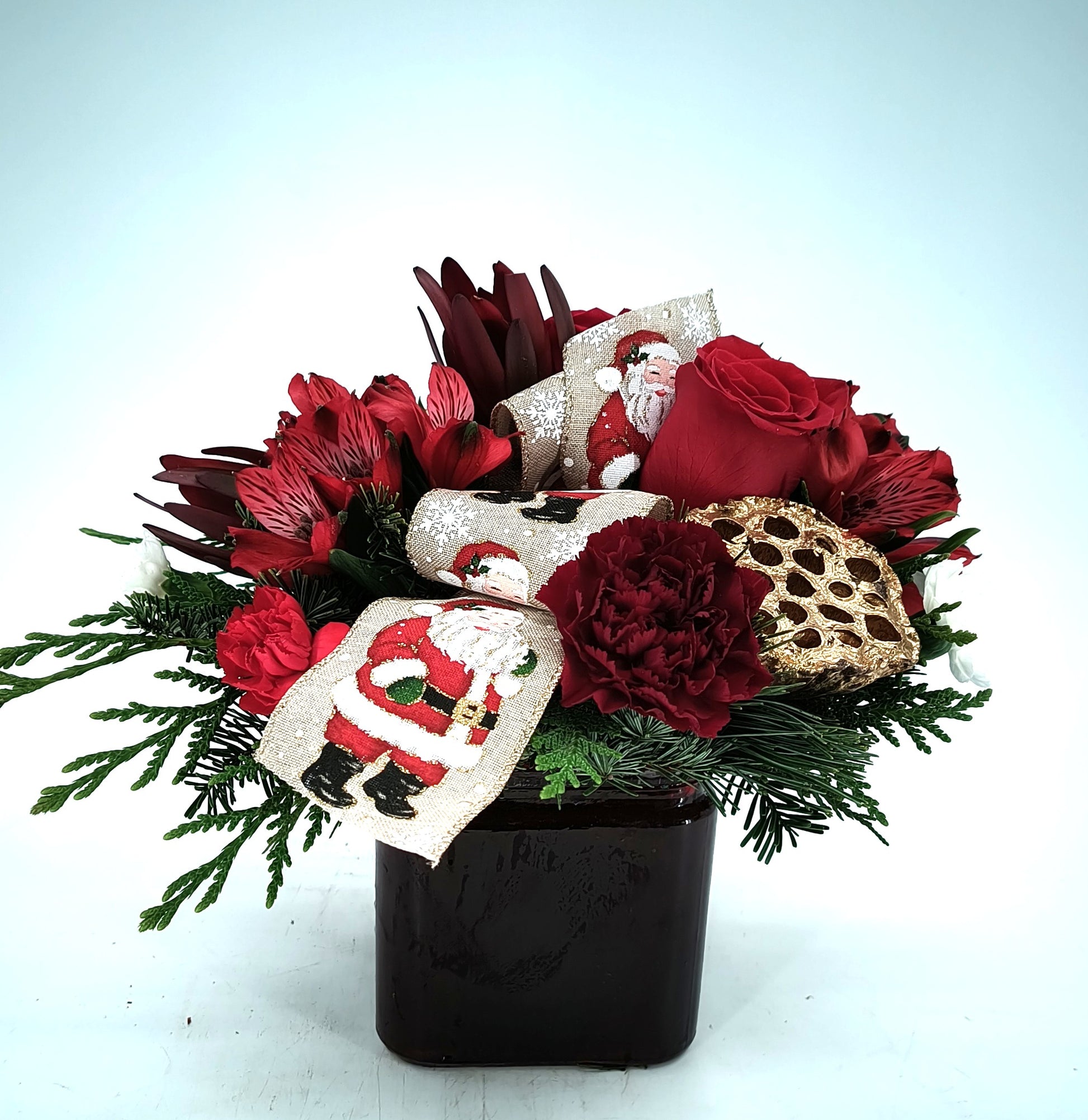 A festive mix of deep red blooms, lush evergreens, and charming Santa-themed ribbon accents come together in this warm, cheerful holiday arrangement.