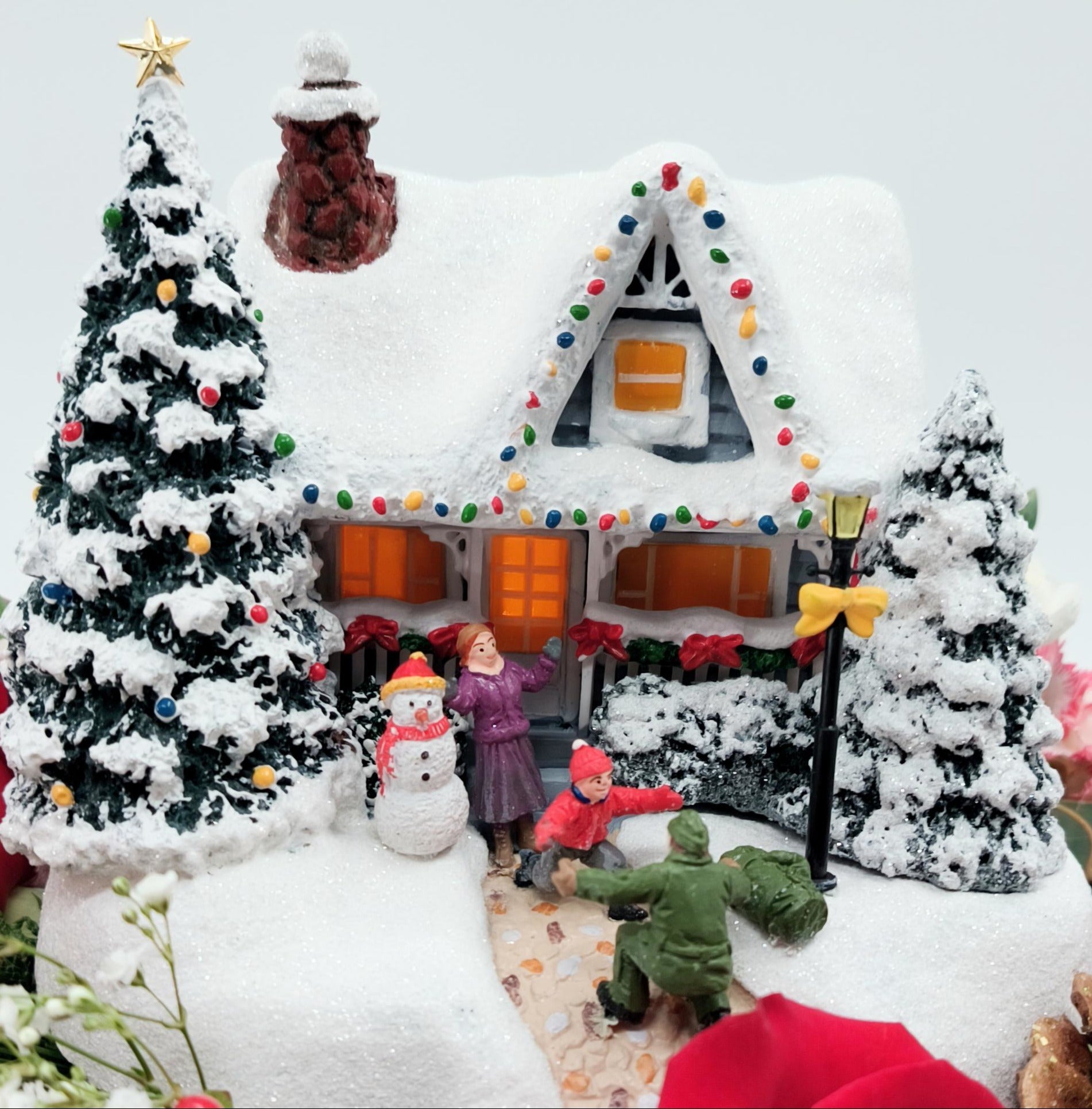Thomas Kinkade's Hero's Welcome from 2020. Bring the magic of a snowy Christmas village to your holiday table. This charming centerpiece features a miniature lit cottage nestled among frosted evergreens, surrounded by a lush ring of festive blooms.